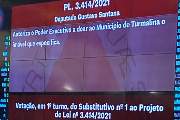 No plenário da Assembleia Legislativa de Minas Gerais, os deputados aprovaram, em primeiro turno, o Projeto de Lei 3414/2021, de autoria do deputado Gustavo Santana, que autoriza o Poder Executivo a doar ao Município de Turmalina um imóvel, para que no local, sejam realizados projetos de assistência social, de promoção da saúde e à prática de atividades esportivas, culturais e de lazer.